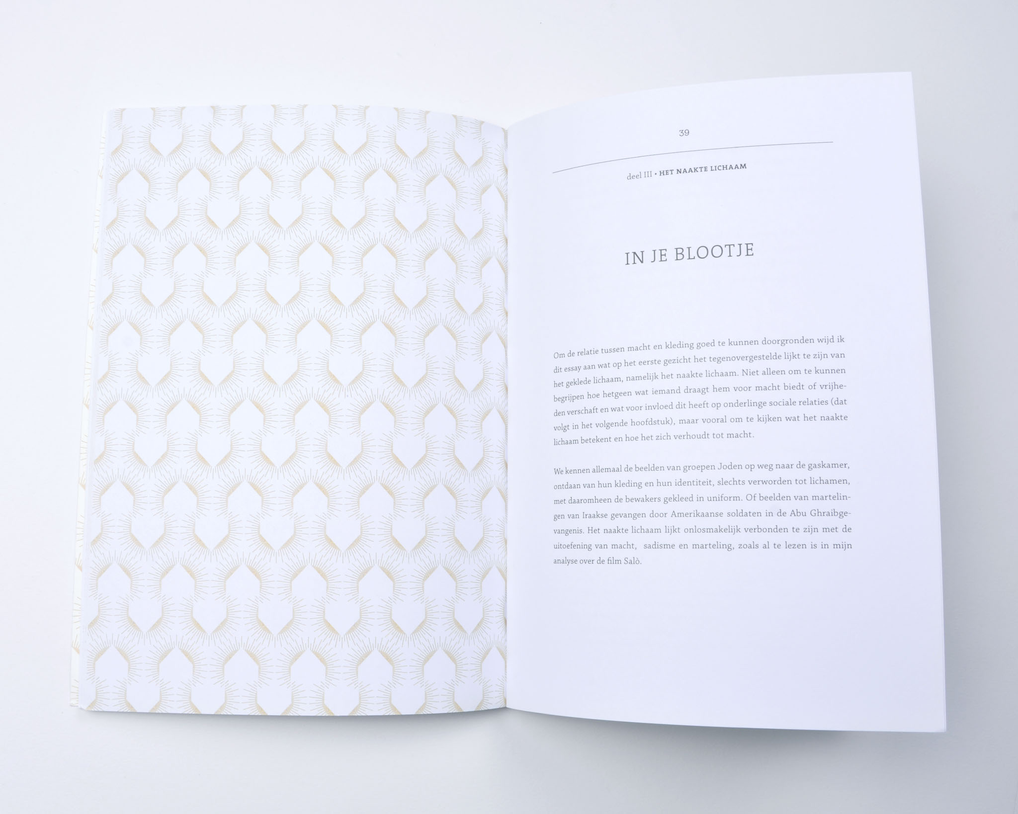 I approached the title literally and put a holy shine around a house, thus linking the design with religeous publications. I duplicated the motif into a pattern throughout the book.